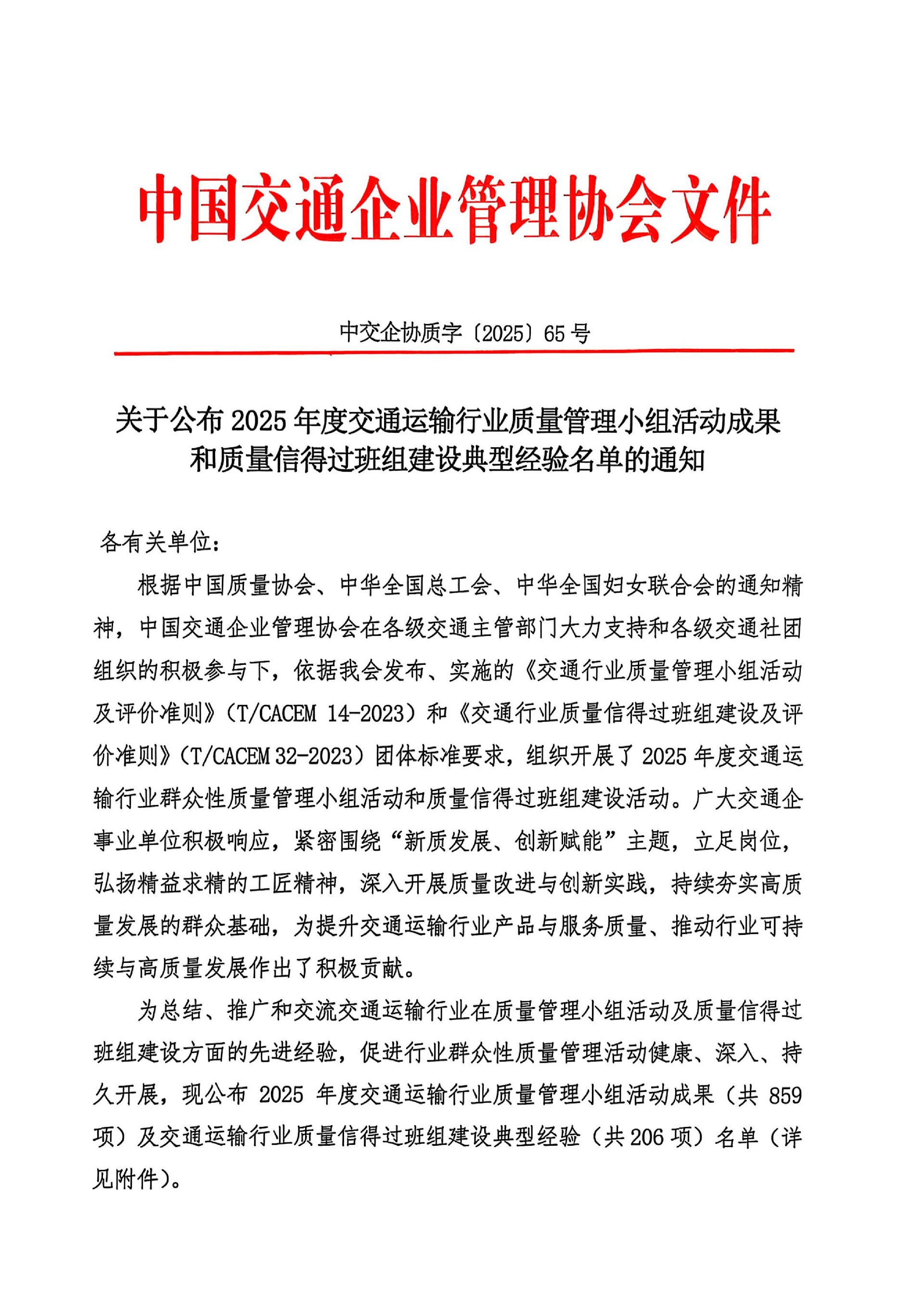 • 2025-11-21 公司質(zhì)量管理成果榮獲全國(guó)交通運(yùn)輸行業(yè)一等獎(jiǎng)